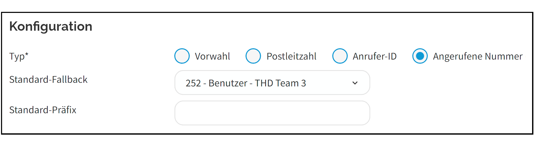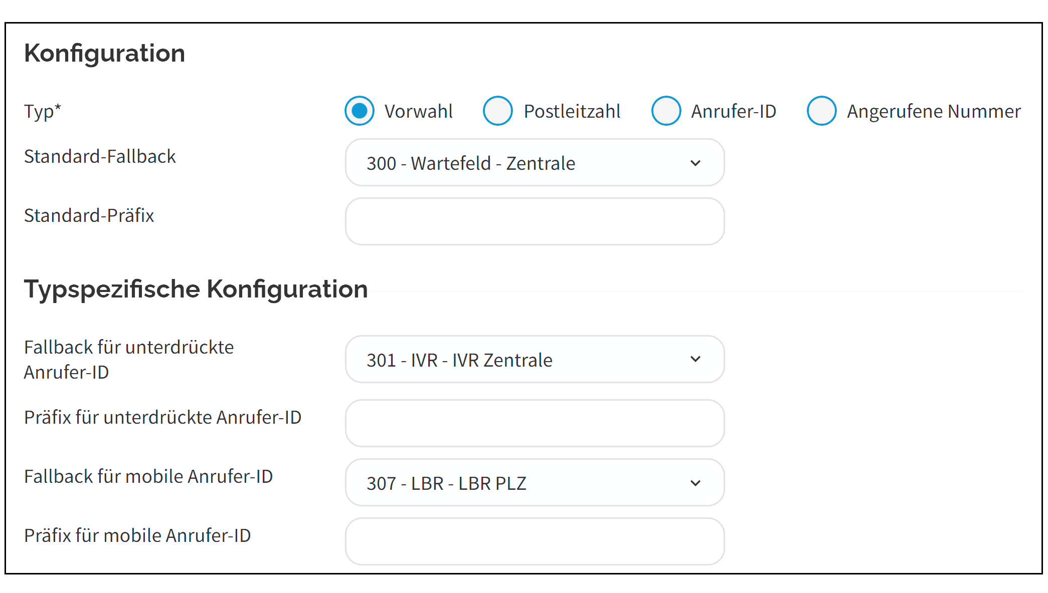 Standard-Fallback | Geben Sie das Fallback-Ziel ein, an das die Anrufer umgeleitet werden, wenn Sie die vom Anrufer eingegebene Vorwahl nicht konfiguriert haben. |