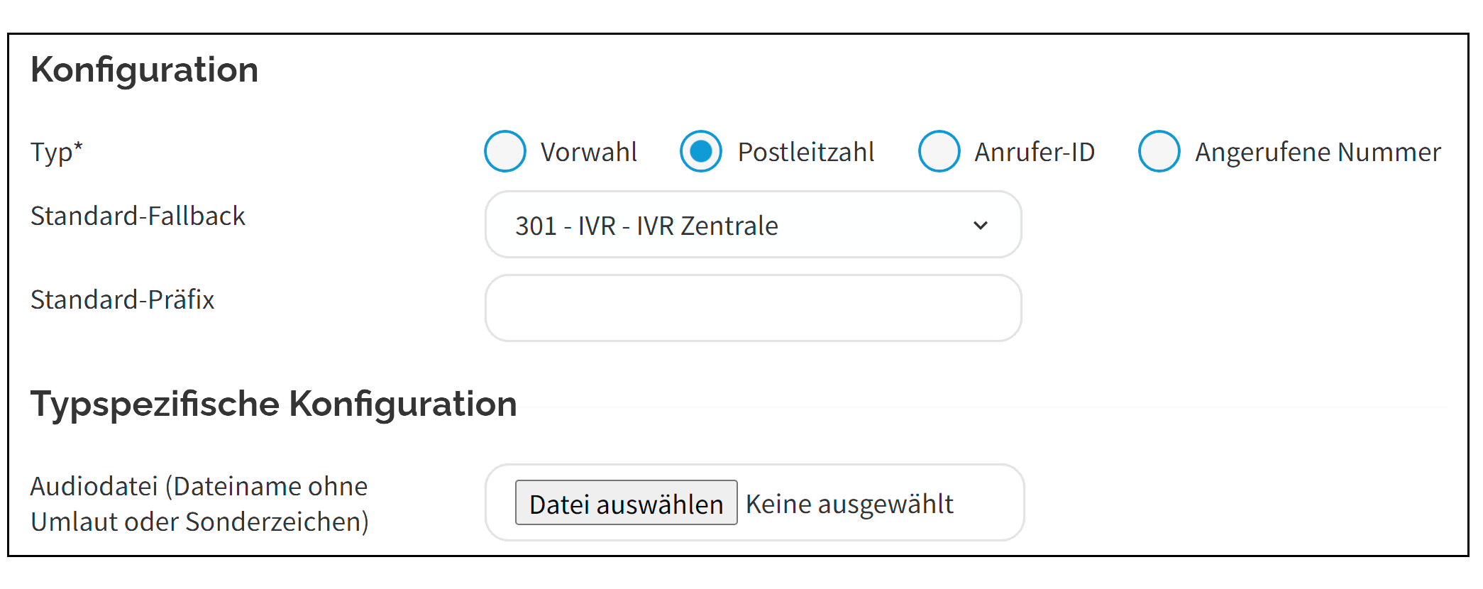 Audiodatei | Laden Sie eine Audiodatei hoch, die den Anrufer auffordert, eine Postleitzahl einzugeben (Sie können auch die Service-Nebenstelle 905 verwenden, um einen Text online aufzunehmen). |