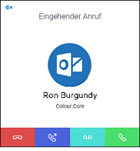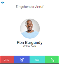Geht für Sie ein Anruf ein, wird ein Anruf an Sie weitergeleitet oder geht ein Anruf ein an eine Gruppe, deren Mitglied Sie sind, erscheint ein Popup-Fenster Eingehender Anruf, welches die Kontaktinformationen des Anrufers enthält.