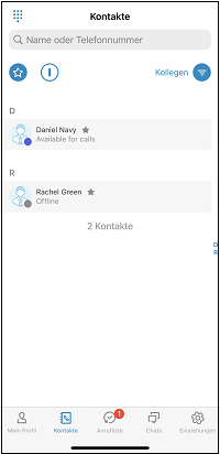 2 . Um die Kontaktquelle zu ändern, tippen Sie auf den aktiven Filter Kollegen,Dienste, Persönliche, Lokale, Gruppen, Wartefelder oder Unternehmen.